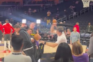 下一篇: 老头手感不错啊!老詹赛前投篮热身连中弧顶三分!